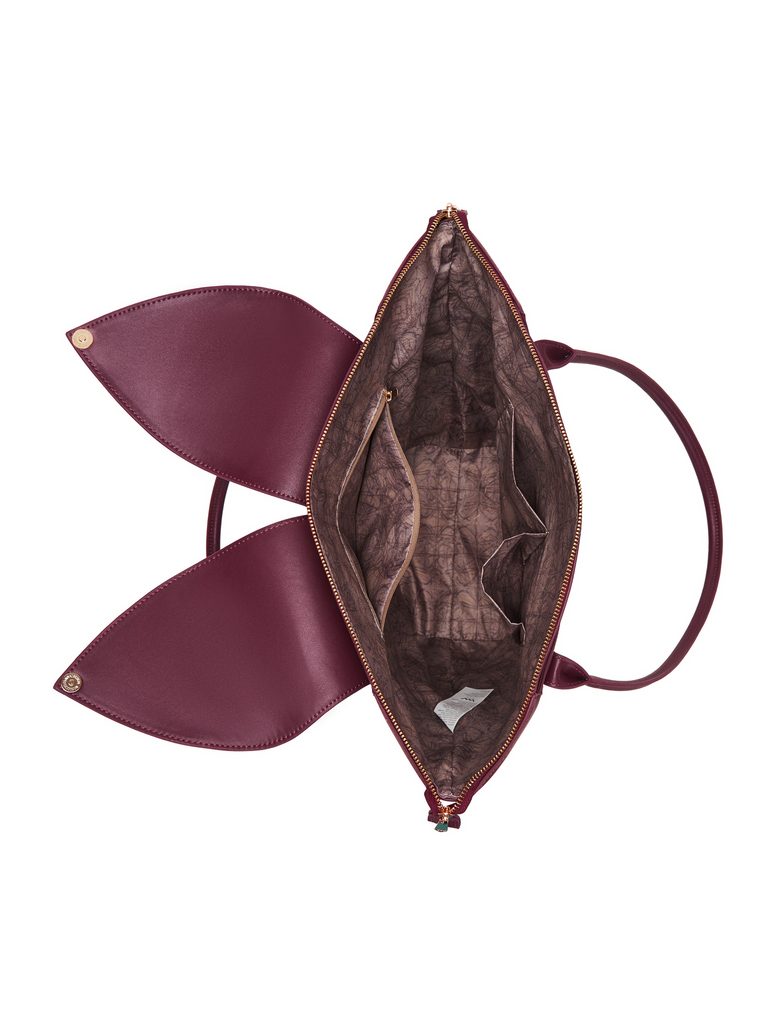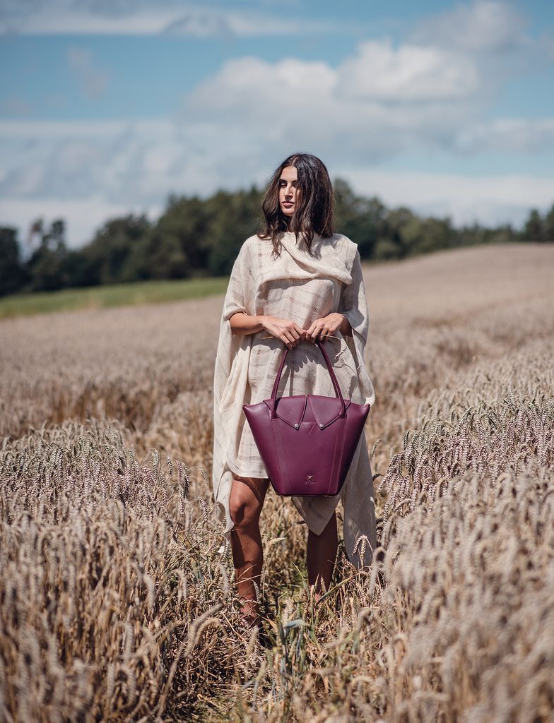 Ta večja različica torbice iz kolekcije Laboratory - Med svetovi je zasnovana za vsakodnevni mestni ritem. Zaradi trdne oblike in velikega notranjega prostora se vanjo spravlja vse, kar potrebuješ – prenosnik, kozmetika in dnevnik. Zapiranje s poklopcem v obliki srajčnega ovratnika daje torbici eleganten in rahlo formalen izraz, vendar ostaja nežno ženska. Nežno vtisnjeni motiv „Vuch × Pavel Berky" v obliki X simbolizira križišče – izbiro med smermi, ki jo vsaka ženska naredi po svoje.