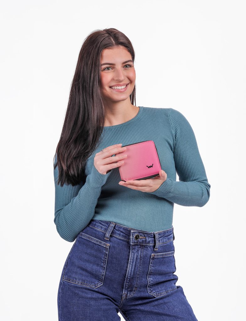 „Zlata srednja pot. Modri pregovor, ki ga je domnevno uvedel že Buda. Mi v Vuch verjamemo, da ga lahko uporabimo tudi za velikost denarnic. Srednje velika denarnica namreč zagotovi dovolj prostora za tvoje dragocenosti in je poleg tega še kompaktna. Ni ti treba razmišljati, ali se bo spravila v tvojo torbico. Boš izbrala denarnico z dominantnimi elementi ali diskretnim dizajnom? Odloči se sama."