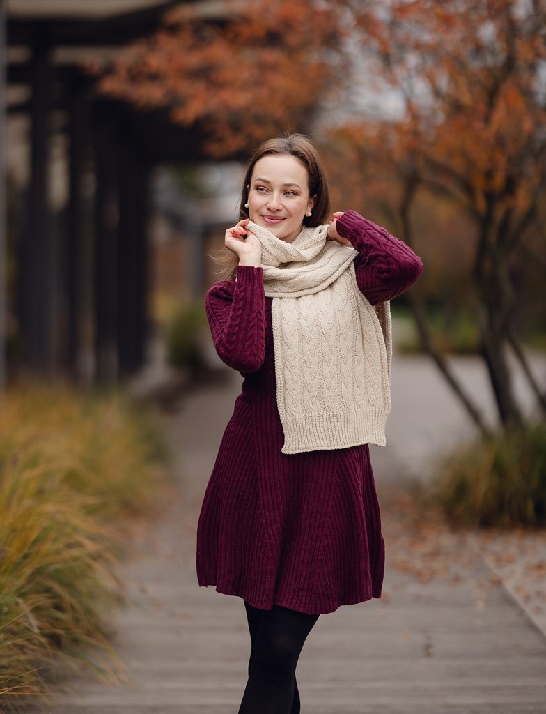 Ta šal ima pleten vzorec, ki se nežno igra z obliko in teksturo, tako da vsak gub deluje nekoliko drugače. Je mehek, greje in hkrati deluje sproščeno, kot da se sam…