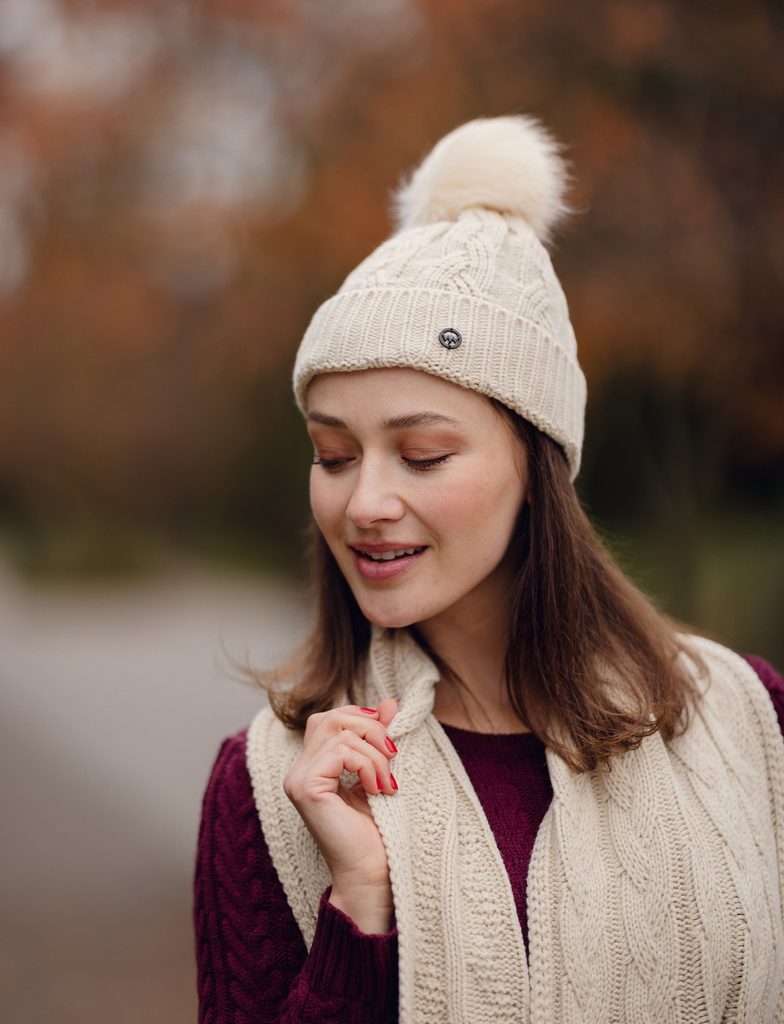 Sheron SC Beige pleteni šal z kovinskim logotipom