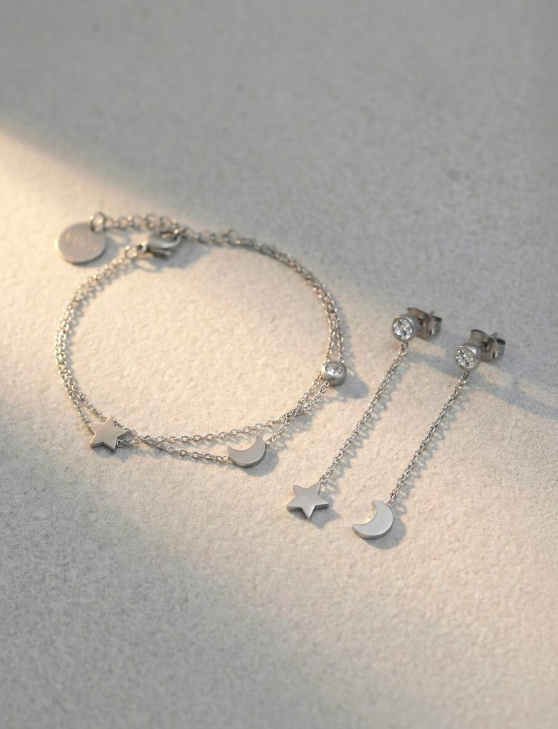 Več informacij„Predstavljajte si, da je vroča poletna noč. Uležete se na odejo in pogledate v zvezdnato nebo. Zvezdi utrinek dirka po nebu in želite, da se vaše najbolj skrite sanje uresničijo. Srebrni uhani z zvezdo in luno so navdihnjeni s tem čarobnim trenutkom.“