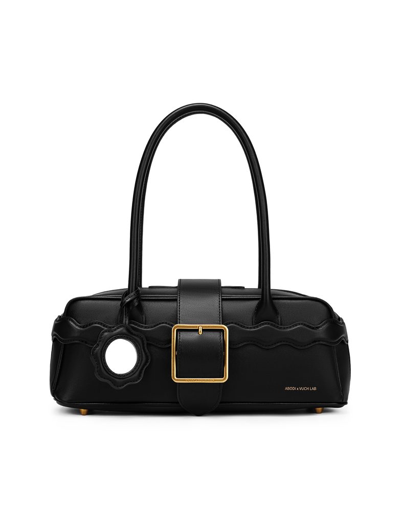 Ta ramenska torbica iz pravega italijanskega usnja najvišje kakovosti vara s svojim vitkim videzom. Vanjo gre neverjetna količina stvari zahvaljujoč podaljšani „east-west“ silhueti in izrazitim dolgim ročajem, ki reinterpretirajo ikonično estetiko začetka tisočletja v modernem konceptu. Na prvi pogled očara masivna avtorska kovinska zaponka na pasu, valovite linije, navdihnjene s transilvansko arhitekturo, in nežen vizualni podpis kolekcije ABODI x VUCH LAB.
