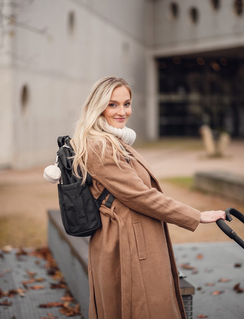 Nahrbtnik, ki ima vse na svojem mestu. Več žepov pomeni več prostora za stekleničko, malico in lastne stvari. Trdna zanka prenese vsakodnevno obremenitev, snemljiv okrogel žepek pa sprejme dudo, ki jo želiš imeti čim hitreje pri roki. Praktičen in trpežen nahrbtnik, pripravljen na vse, kar dan prinese, ne glede na to, ali se premikaš po mestu ali si na izletu z otroškimi vozički.